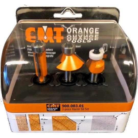 Du står overfor et professionelt kantfræsersæt fra CMT, som indeholder tre essentielle værktøjer til dine fræseprojekter. Sættet består af følgende: